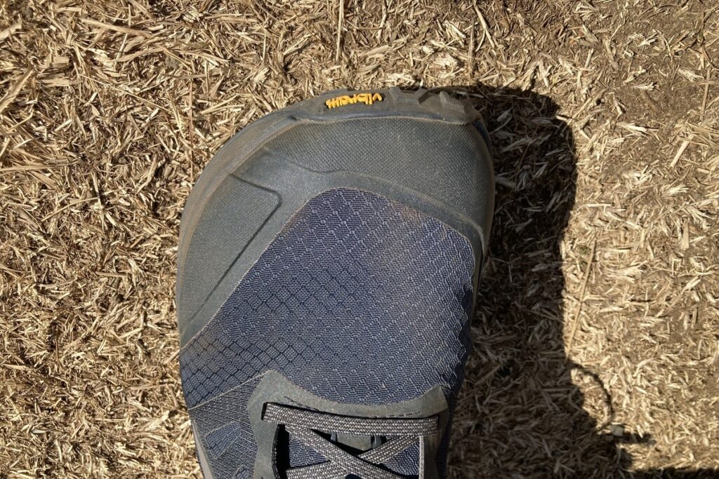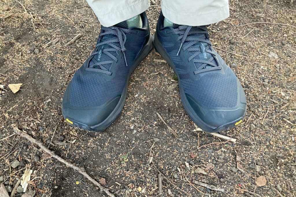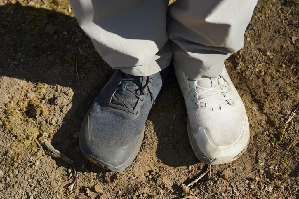 これまで登山靴に履き慣れた人にとって、アルトラのフットシェイプに不安を感じるかもしれません。ですが、ローンピーク9+はつま先にゆとりがありつつもズレにくく、トレイルでの下りでもしっかりと足とシューズをホールドしてくれます。