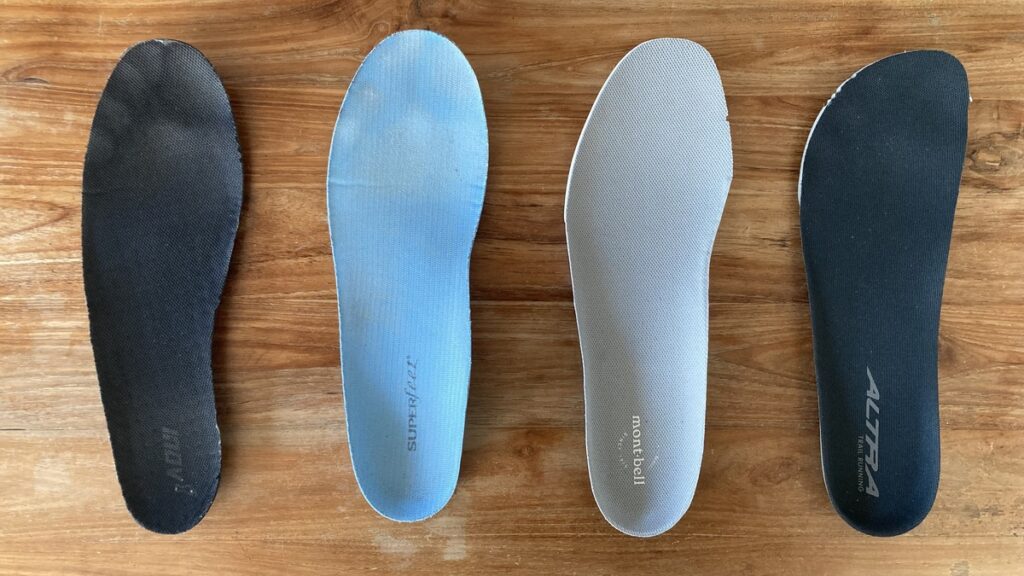 アルトラのシューズを履いたことがある人にとっては言わずもがなかもしれませんが、とにかく履き心地が良く、その理由は靴つま先が広がるような形状になっていること。自然な足の形状を邪魔しないようにラスト(足形)が形成されているため、圧迫感を感じることがなく、靴の中で指を動かすことができます。他のシューズとインソールの形状を比べてみるとより分かりやすく、アルトラのインソールは親指部が1番長く、指の位置がワイドになっているのが分かります。