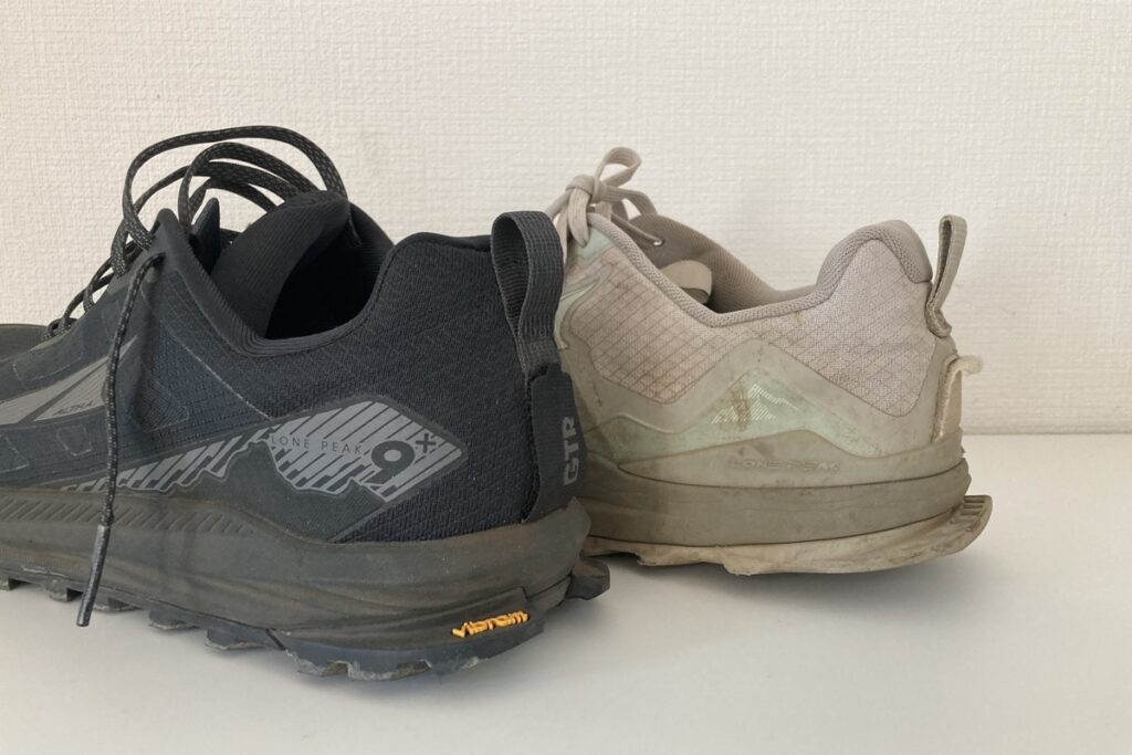 ローンピーク7はかかと部が浅く感じ、また柔らかく、ホールド力にやや頼りなさを感じたのに対しローンピーク9+はかかと部のホールド力が大幅に改善されており、少し硬めになっていることでよりしっかりとフィットしてくれると感じました。