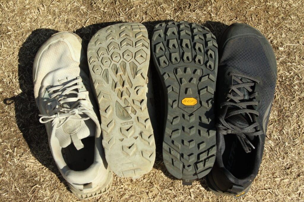 アウトソールはビブラムメガグリップで、ローンピーク9+の目玉と言っていいところ。ビブラムソールを使ったローンピーク9+は濡れた岩や路面からぬかるみまで悪路の強さは想像以上でした。深い溝のラグパターンと足の大きさよりもかなり広く形作られた接地面が、安定性を高めてくれることでより路面状況に影響されず安心して歩くことができました。