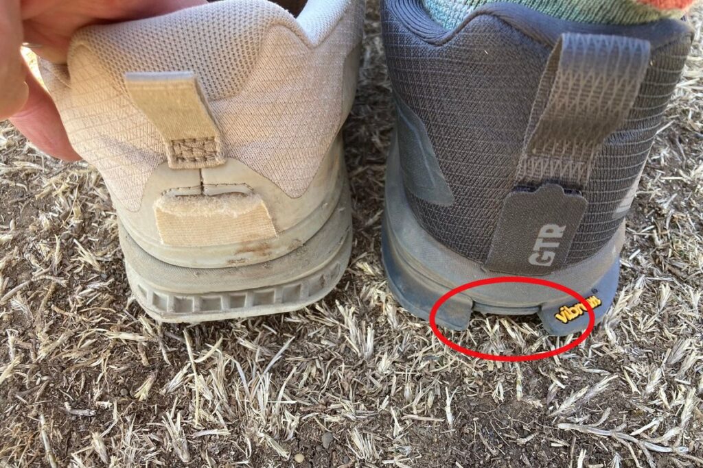 ロンピーク7でトレイルを歩いていると、かかと部のでっばりが引っかかってしまうことがありましたが、ローンピーク9+は切れ込みが入っていることで引っかかることが格段に減りました。